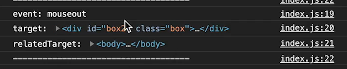 그리고 이 창을 보면, relatedTarget은 body, target은 box2이고, event는 mouseout이다. 종합해보면 box에서 body로 마우스가 이동했다는걸 알 수 있다.