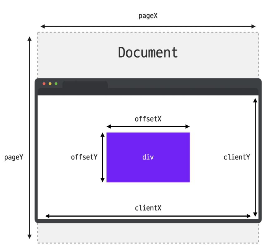 | clientX, clientY | 마우스 포인터의 브라우저 표시 영역(이벤트가 발생한 순간에 브라우저가 콘텐츠를 표시할 수 있는 영역)에서의 위치 | client 값은 그 순간 보여지는 화면을 기준으로 계산하기 때문에 스크롤 위치와는 무관하게 항상 보여지는 화면의 좌측 상단의 모서리 위치를 (0, 0)으로 계산한다. |