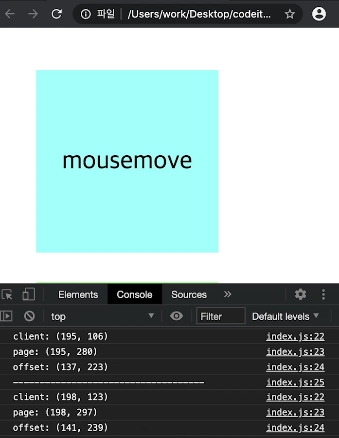 | offsetX, offsetY | 마우스 포인터의 이벤트 발생한 요소(이벤트가 발생한 target이 기준)에서의 위치 | offset 값은 이벤트가 발생한 대상을 기준으로 계산하기 때문에 스크롤 위치와는 무관하게 항상 대상의 좌측 상단의 모서리 위치를 (0, 0)으로 계산한다. |