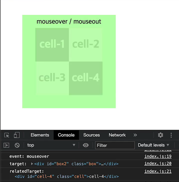 console창을 보면 relatedTarget은 cell-4 target은 box2이다. event는 mouseover이니, 종합해보면 cell-4에서 box2로 마우스가 이동했다는걸 알 수 있다.